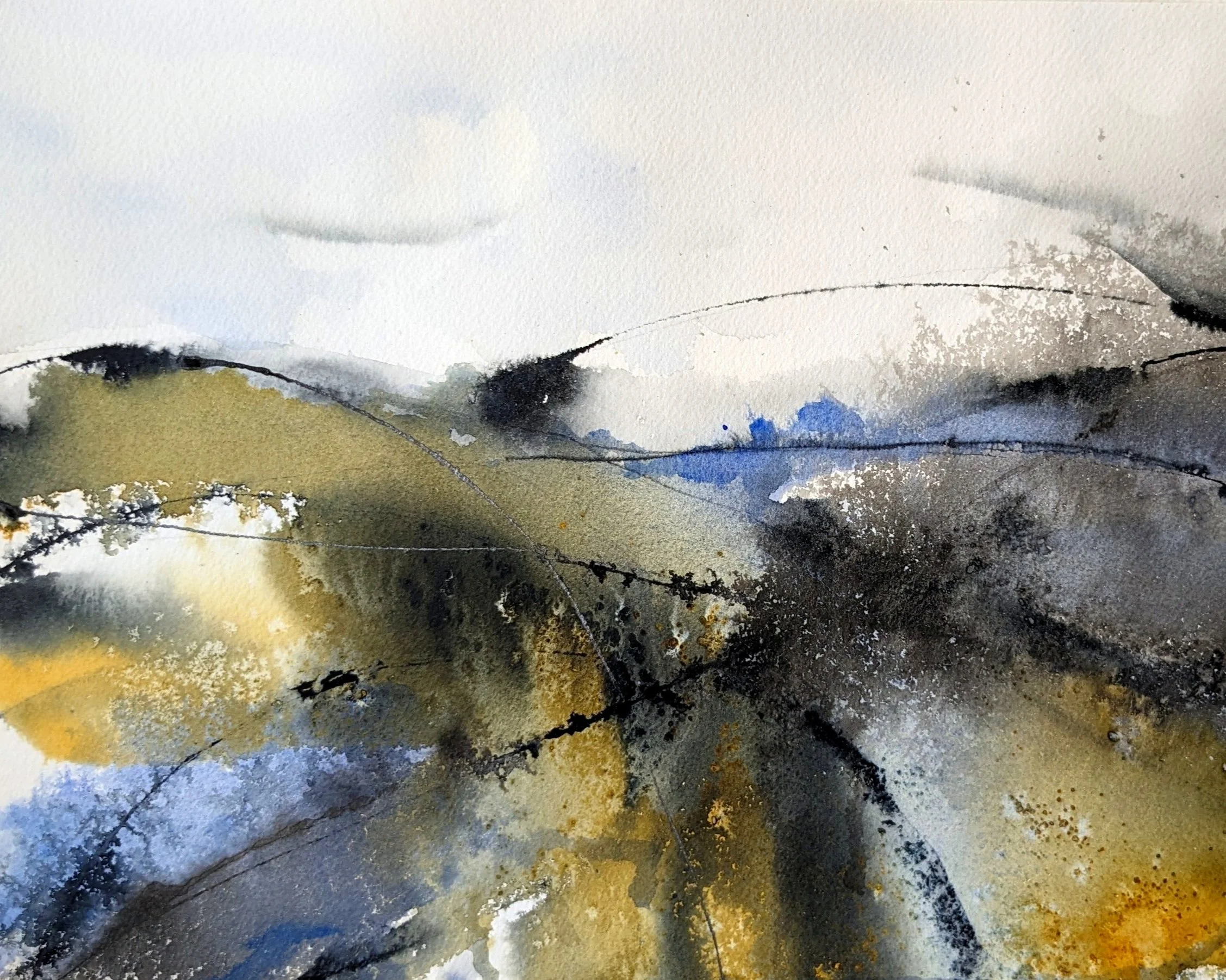 Start small to learn how easy it is to create compelling, colorful landscapes with only minimal detail. We’ll work on half-sheets of paper, wet and dry, using our usual watercolor paints, and experimenting with acrylic inks and dry pigment if you like. All it takes is a little courage and washable clothing!